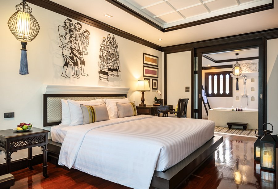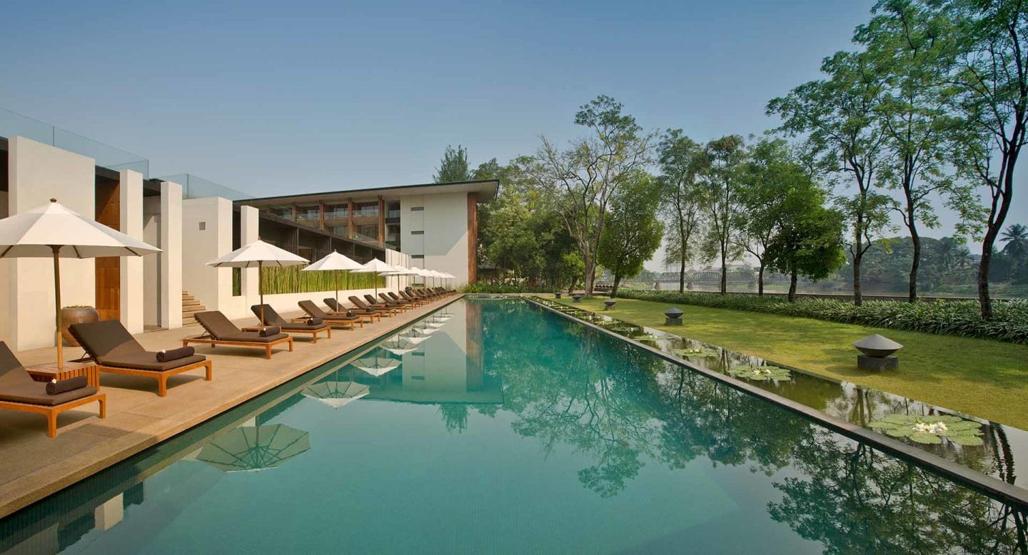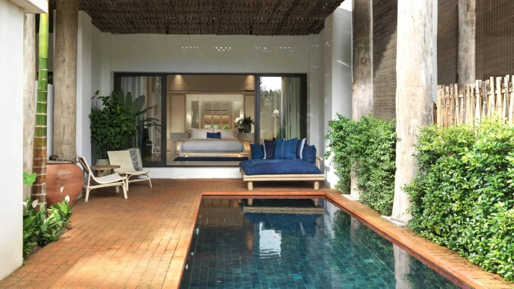 The resort’s courtyard is interspersed with leafy 100-year-old tamarind trees, while the rooftop infinity pool overlooks the tranquil flow of the Ping River.