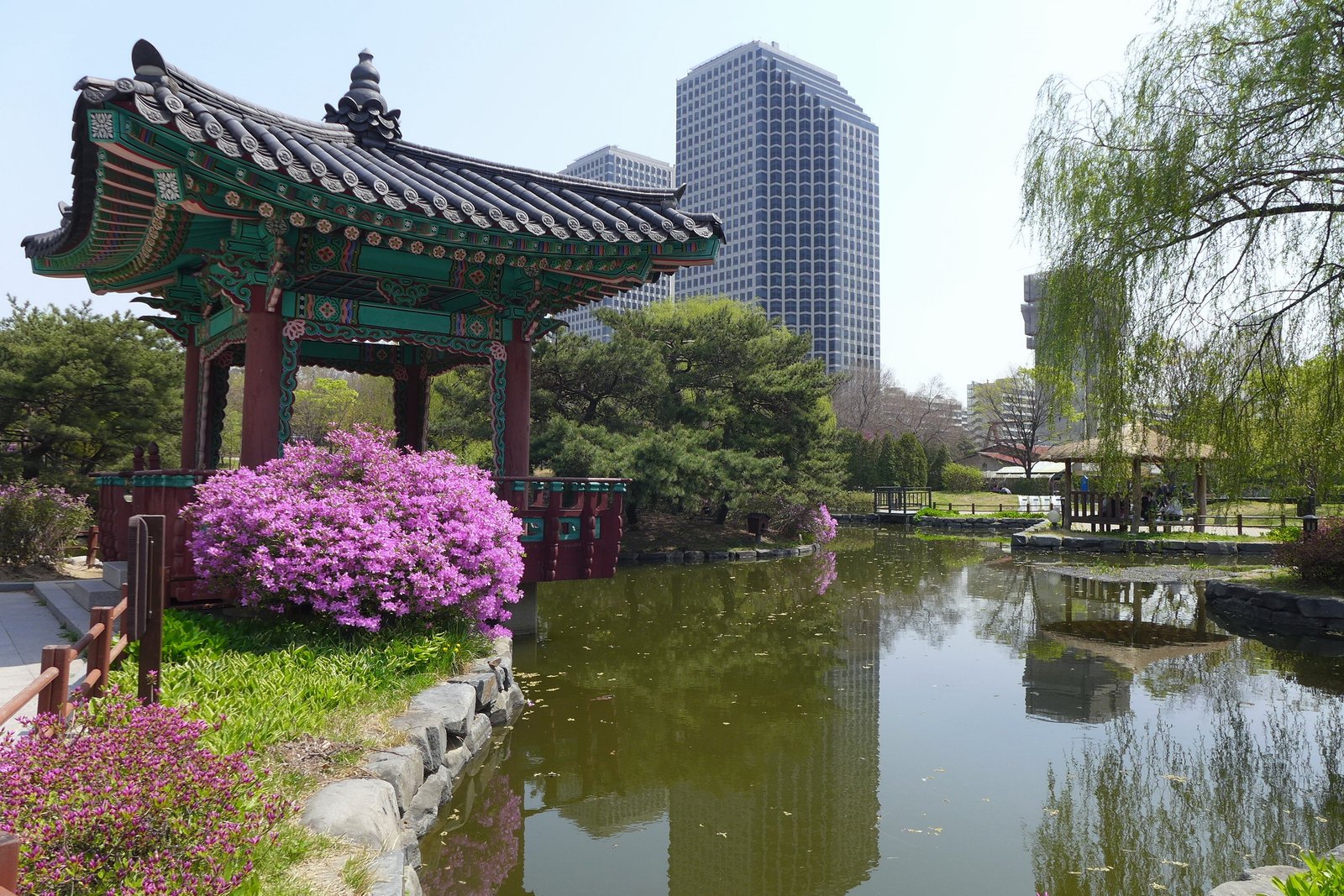 Gyeongbokgung (The Palace of Shining Happiness), which takes up the majority of the northwest of the city, is so large that it functions as a community unto itself. Up to the Japanese invasion in the late 16th century, it was built in 1394 and served as the imperial capital. The columned pavilions, lily-covered lakes, feudal towers, and decorative rock gardens within its gates are unlike anything else in nearby Seoul, making a meander through them feel like stepping into a time warp. The one-story National Folk Museum is located in the northeastern part of the grounds and uses models and dioramas extensively to depict Seoul’s early history. The National Palace Museum, a lovely structure itself containing such works of art as sculpted dragons, carved tablets, and a famous royal screen, is located in the other direction, at the far southwestern tip of the grounds.